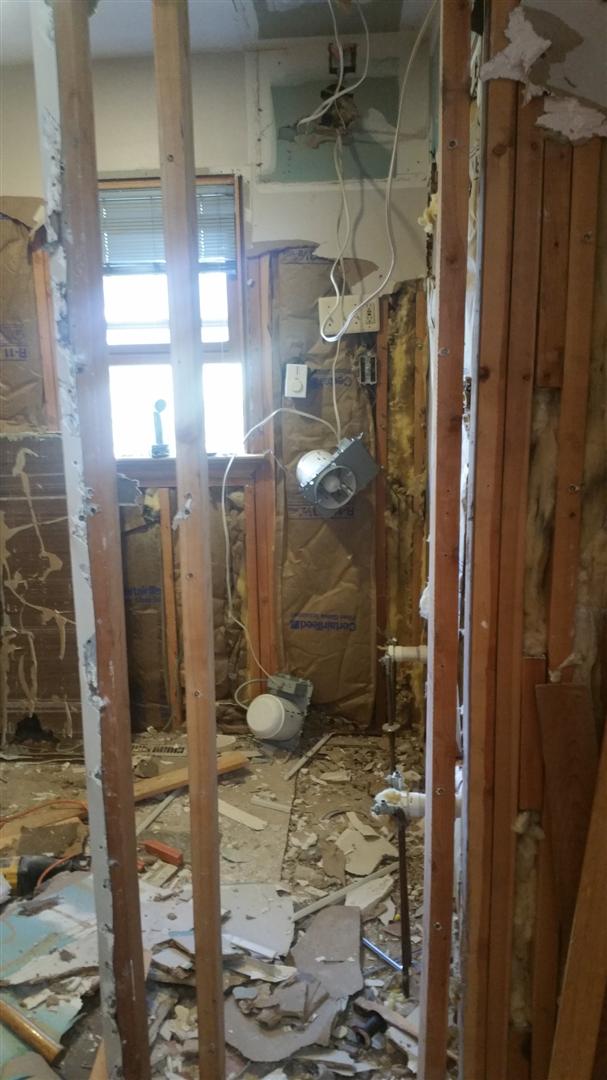 This bathroom renovation in Denville, NJ called for gutting the bathroom down to the studs. The old tub and shower were removed and a new shower was installed. The toilet was moved about four feet. A new double sink 60-inch vanity was installed. New recessed lighting was installed.