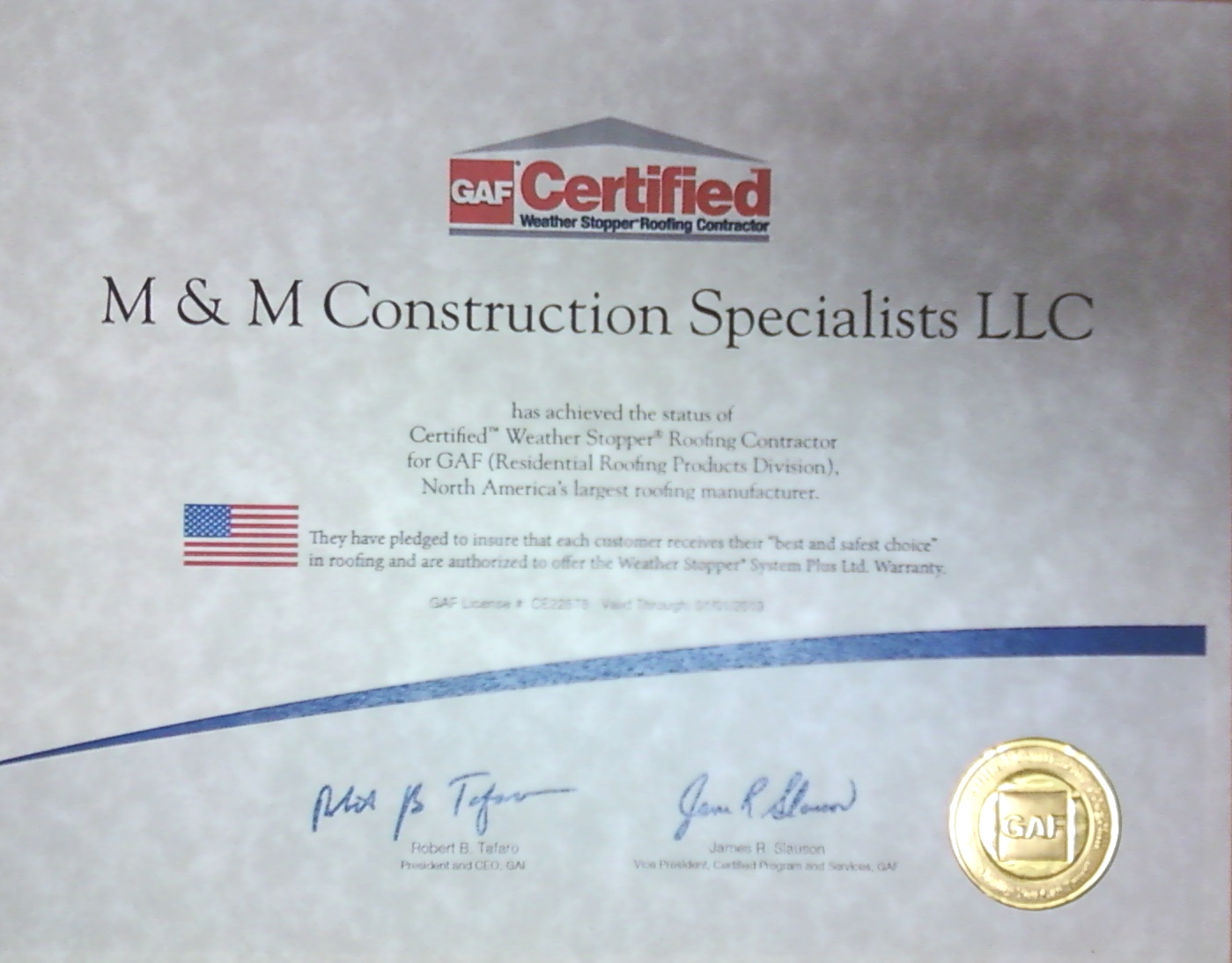 We are proud to announce that M&M Construction Specialist is now a GAF Certified NJ Roofing Contractor. GAF has certified us for installing New Jersey roofing products and offers GAF’s System Plus Limited Warranty on all residential or commercial New Jersey GAF roofs.