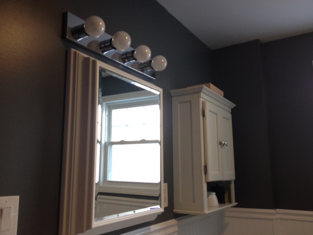 The bathroom in Hasbrouck Heights is completed – new vanity light, mirror, and storage unit installed on the wall.