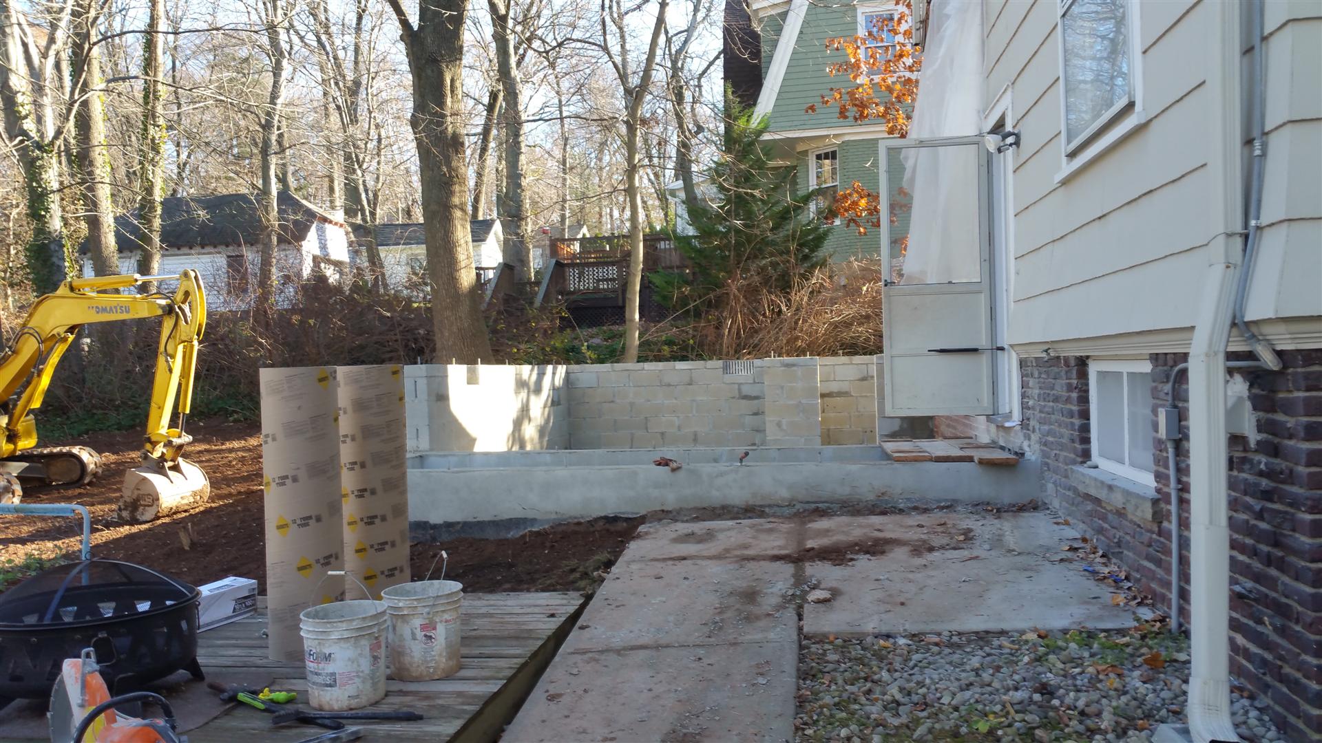 A view of the newly completed foundation walls on the side of the addition.
