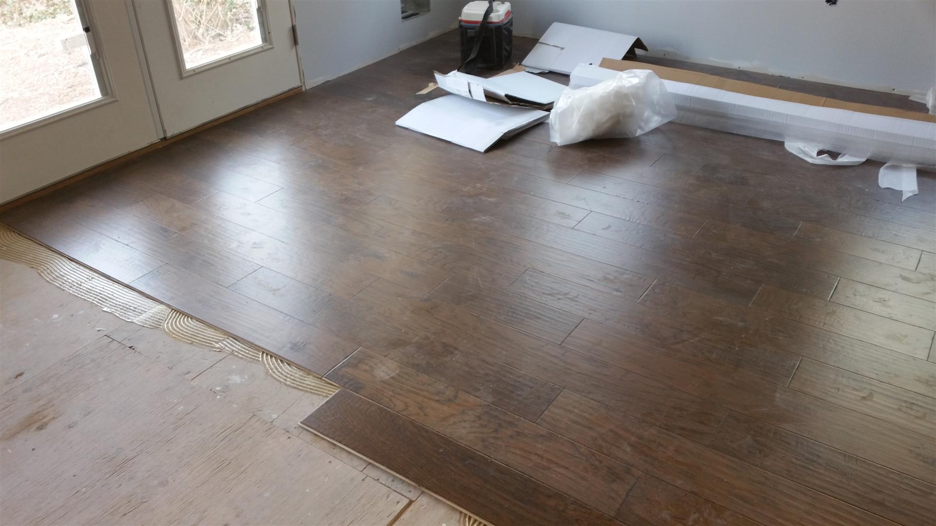 Laminate wood flooring being installed.