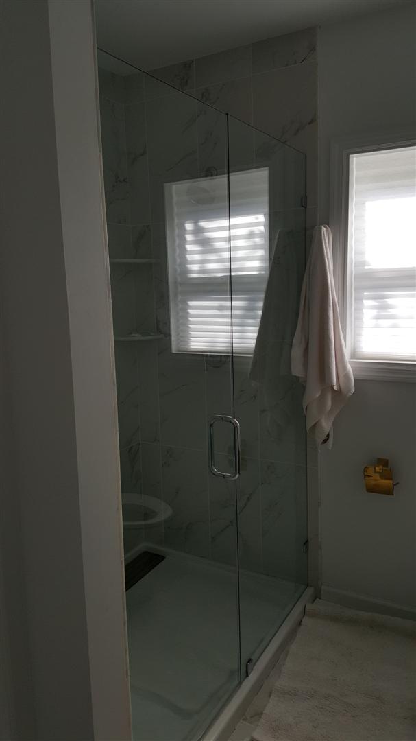 The brand new bathroom features a lovely vanity, shower with sliding glass doors, and a neutral tile.