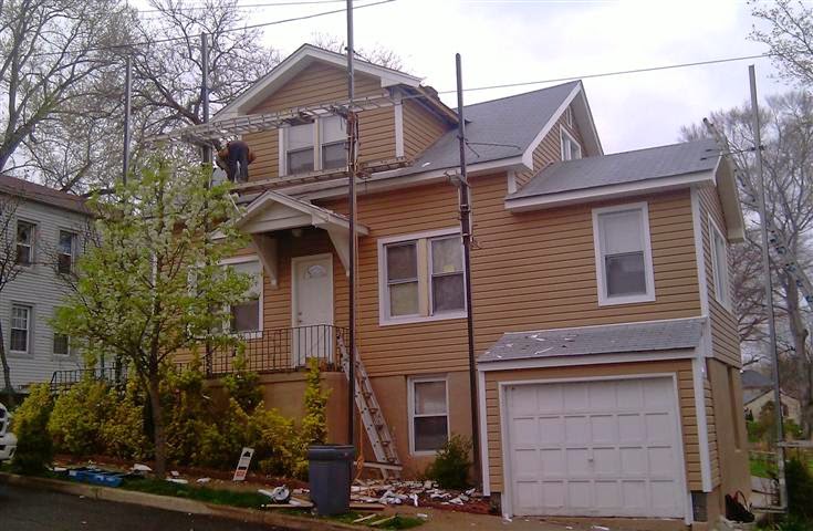 This job in Teaneck, New Jersey involved installing new siding and a portico at the side entrance. The project including removing four layers of siding (vinyl, asphalt, cement board and cedar shakes). Installed Tyvek house wrap around envelope of building and installed energy efficient Alside Prodigy vinyl siding.