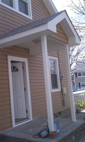 A job in Teaneck, New Jersey involved installing new siding and a portico at the side entrance. The project including removing four layers of siding (vinyl, asphalt, cement board and cedar shakes). Installed Tyvek house wrap around envelope of building and installed energy efficient Alside Prodigy vinyl siding.