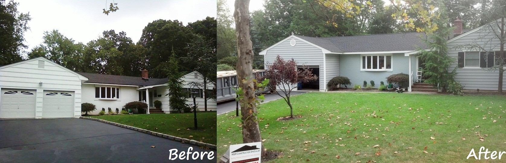 This home in Mountainside, New Jersey received new Alside Prodigy insulated vinyl siding. The original cedar shakes were removed, new weather barrier was laid, and the insulated siding was installed. All of the windows were wrapped with PVC aluminum, new vinyl soffit was installed, shutters on the front elevation, and the brick portion of the front was painted to match the siding color.